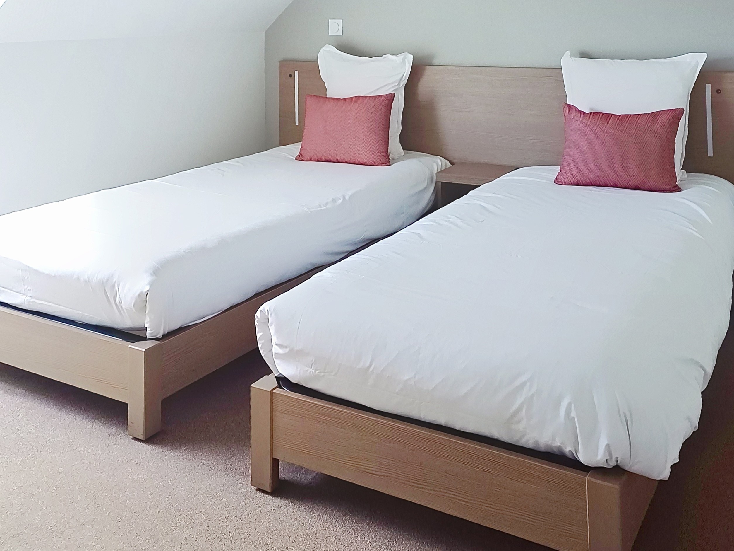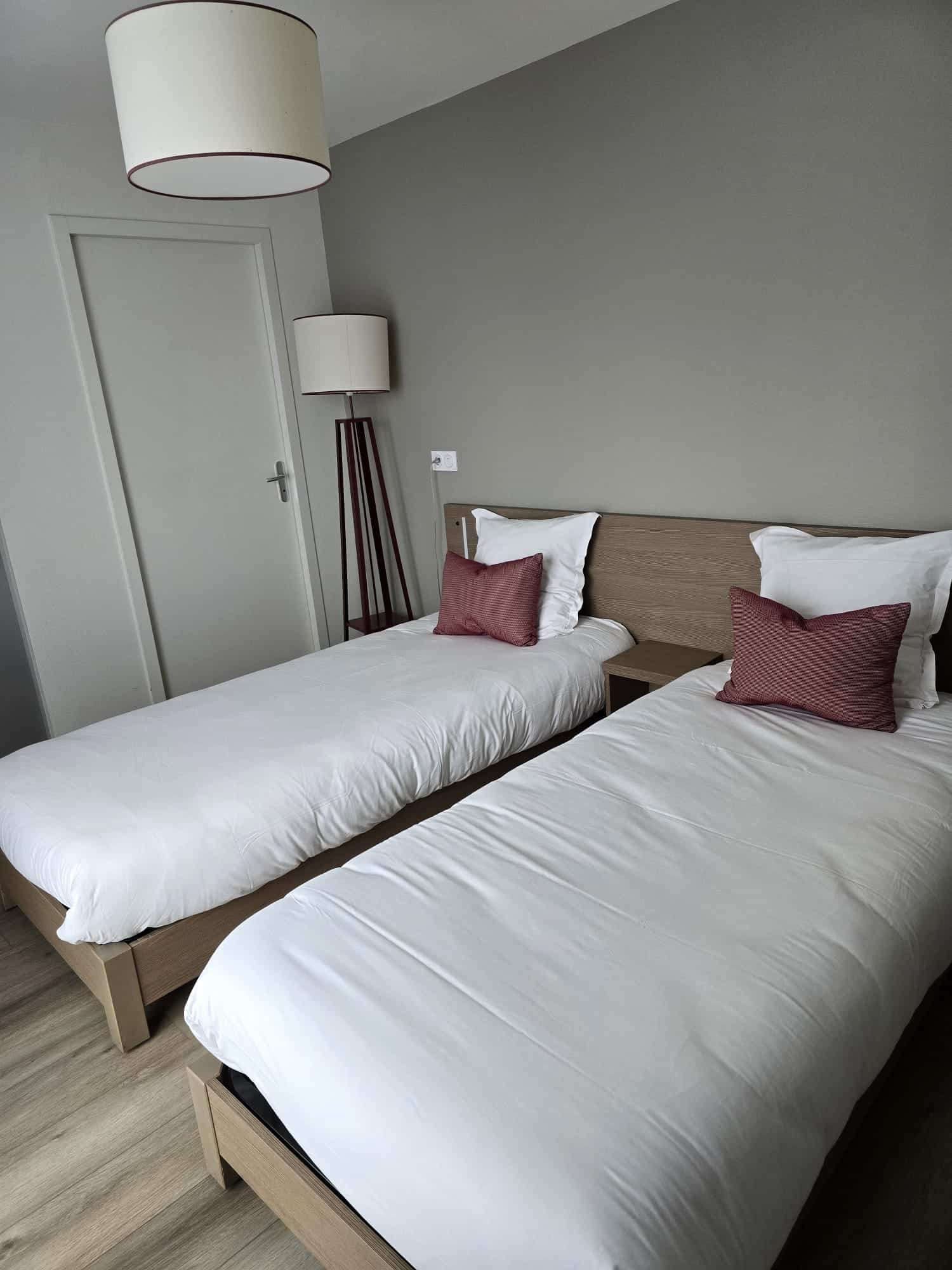 Appartement 2 pièces confortable de 30 m² comprenant une chambre avec deux lits simples, et un séjour avec un canapé convertible, un espace bureau, télévision écran plat.