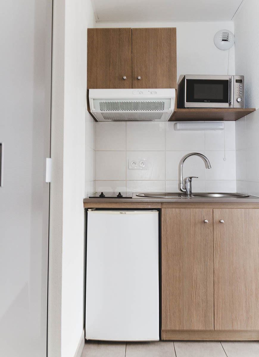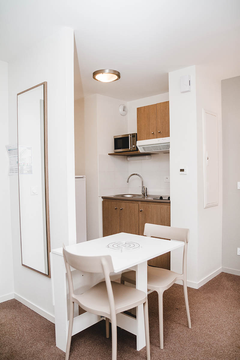 Pour vous restaurer cet appartement comprend aussi un  coin cuisine entièrement équipée (réfrigérateur, four micro-ondes, lave-vaisselle, coin repas, bouilloire électrique, ustensiles de cuisine et vaisselle, plaque de cuisson…). Chaque appartement comporte aussi une salle d’eau privative avec douche, WC et sèche-cheveux.