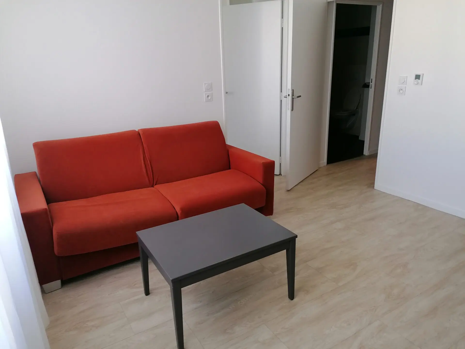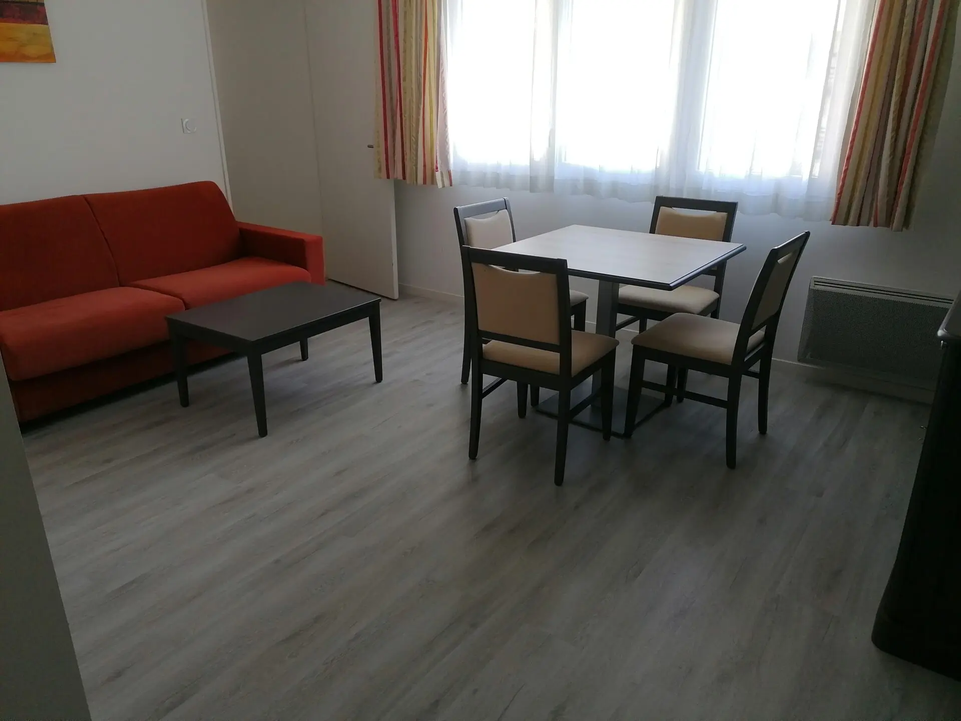 - Un séjour convivial avec espace repas, télévision et banquette-lit simple (100×190).