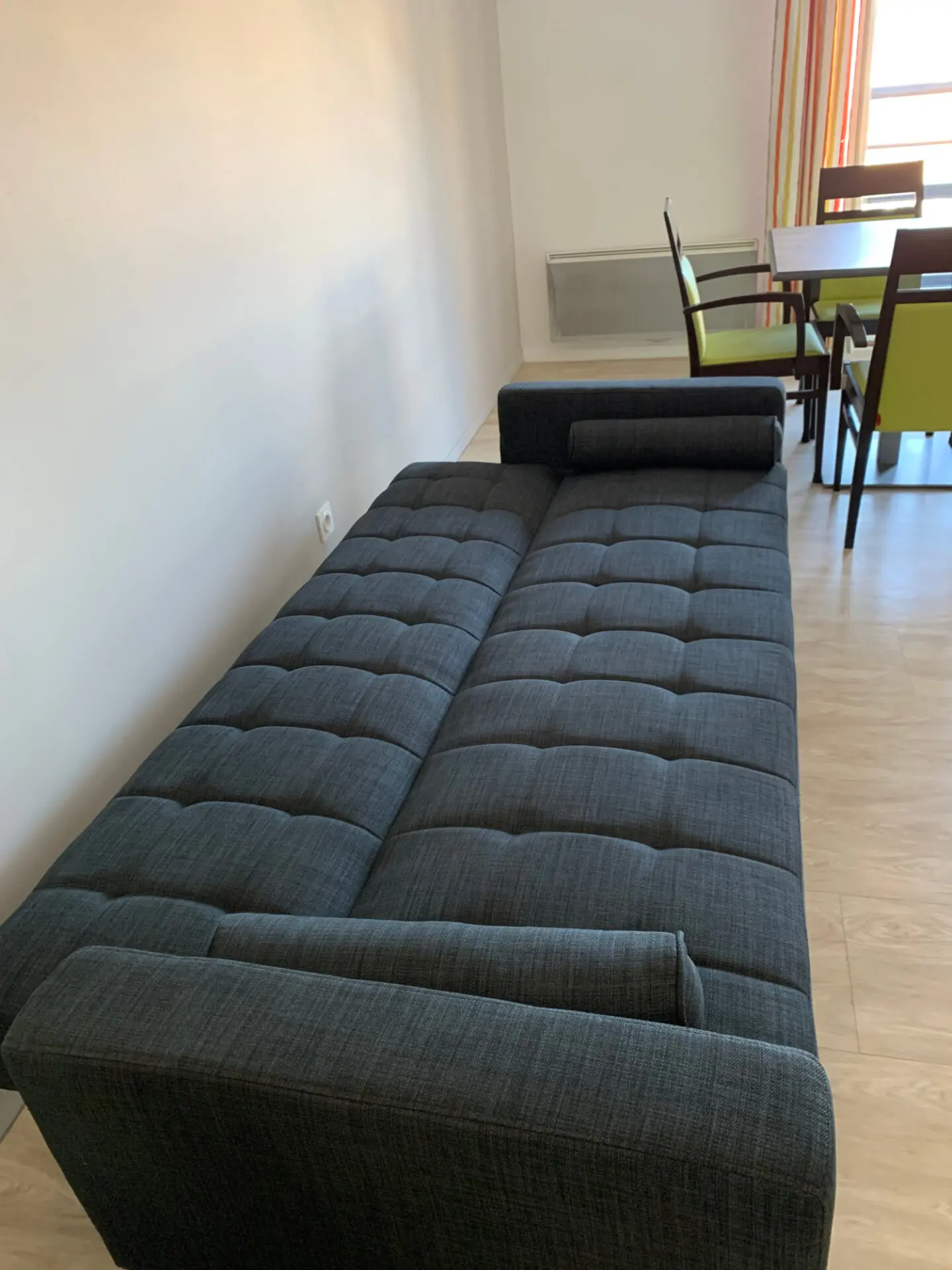 - Un séjour lumineux avec coin repas, télévision et canapé-lit double (140×190).