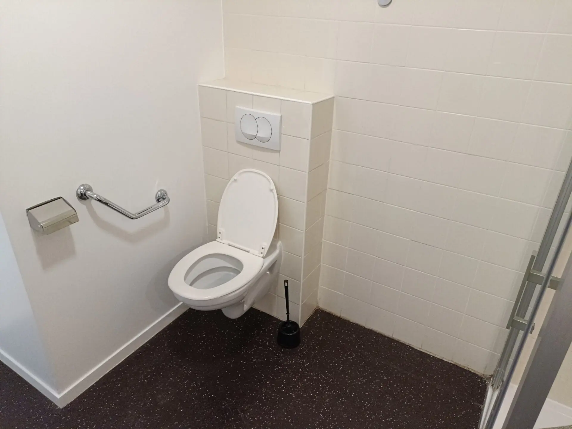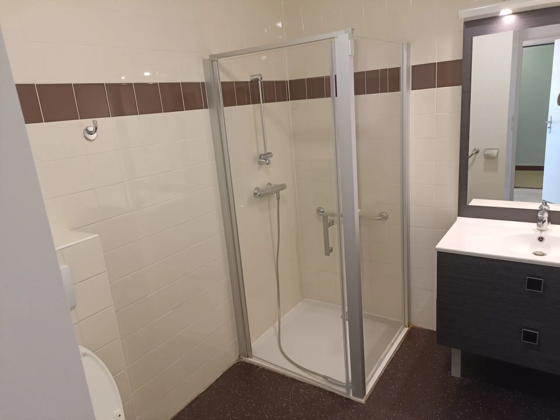 - Une salle d’eau fonctionnelle avec douche, lavabo, grand miroir, sèche serviette et toilettes intégrées.