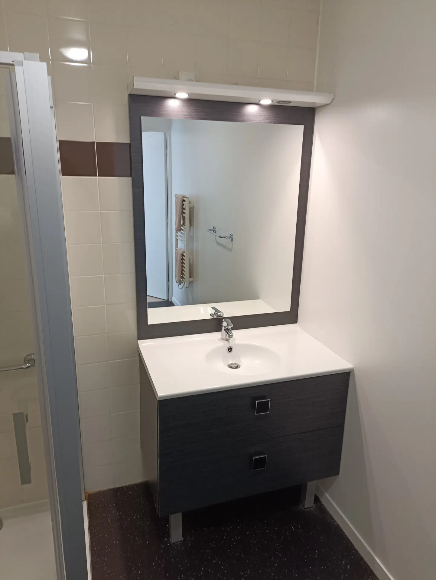 - Une salle d’eau moderne avec douche, lavabo, sèche-serviettes et grand miroir.