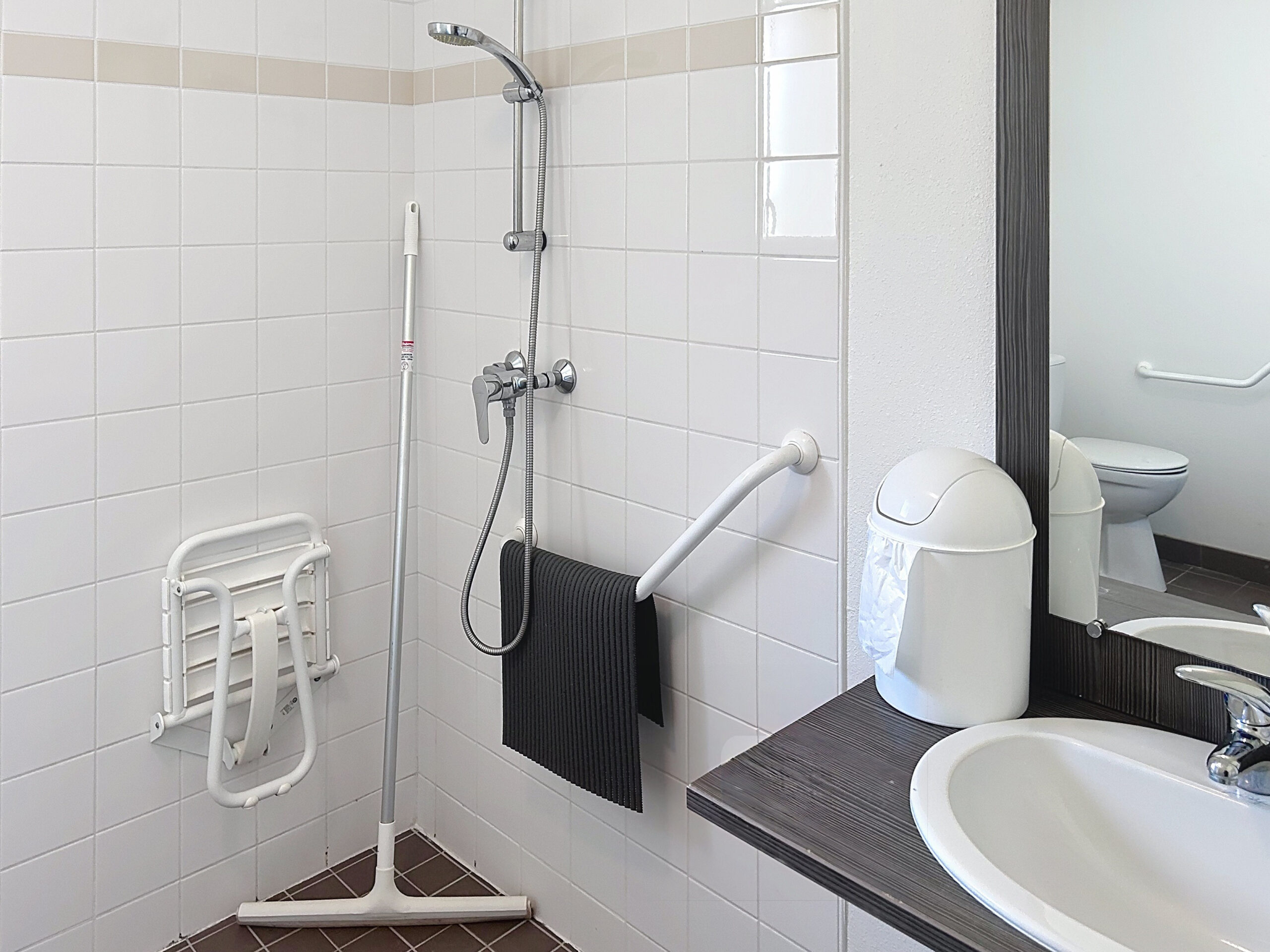 - Une salle d’eau adaptée PMR avec douche de plain-pied, lavabo accessible, sèche serviettes, grand miroir, ainsi que des toilettes aux normes PMR.